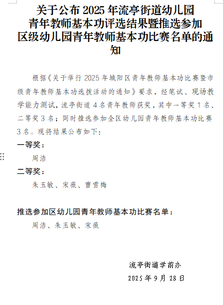 為深入貫徹新時(shí)代學(xué)前教育高質(zhì)量發(fā)展要求,全面推進(jìn)教師隊(duì)伍建設(shè)提質(zhì)增效,流亭街道于9月份成功舉辦幼兒園青年教師基本功比賽。本次活動(dòng)以“夯實(shí)基本功·錘煉礪成長”為主題,通過園級(jí)、片區(qū)級(jí)層層選拔,**終推選出4名**青年教師參加街道級(jí)決賽。